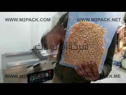 العمل علي ماكينة فاكيوم غرفتين لتفريغ الهواء من أكياس حبيبات غذائية لحفظها موديل 603 ماركة إم توباك