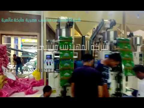 عرض داخل أحد المصانع لمجموعة من ماكينات موديل 903 ماركة المهندس منسي لتعبئة حبوب ارز كيلو بسيور رفع